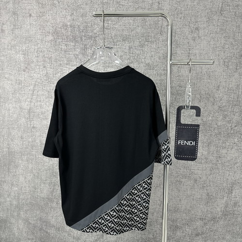 ラウンドネックのルーズな半袖Tシャツ。 ブラックの無地素材。 グレーのフェンディ斜めインサートとライトグレーのストライプが施されています。