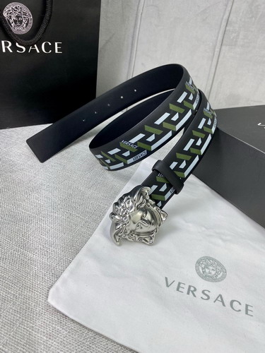 幅4.0cm VERSACE しなやかなカーフレザーにラ・グレカのプリントを施し、3Dメデューサのバックルをあしらったクラシックなヴェルサーチのベルト。